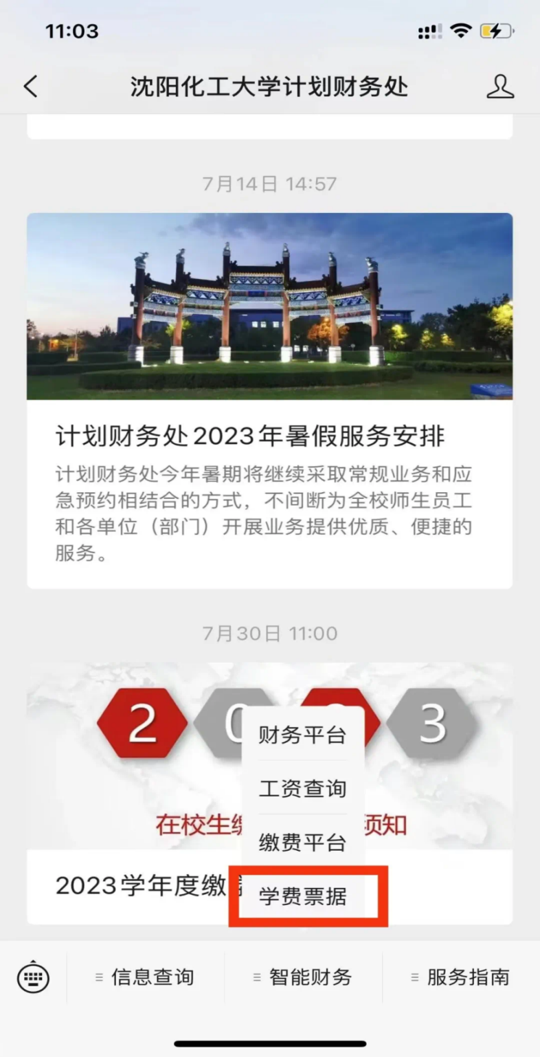 领取方法:关注沈阳化工大学计划财务处公众号,点击智能财务—学费票据。